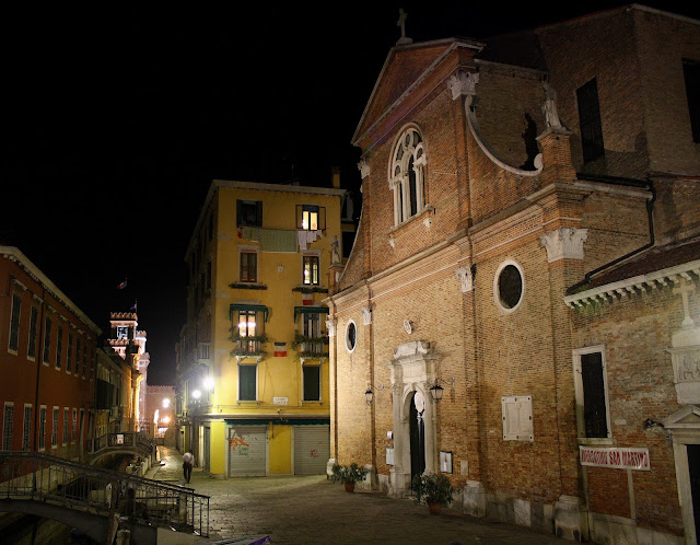In the course of trying to take this picture I realized how oppressively well-lit parts of Venice are: high-powered floods, even a surveillance camera or two. Perhaps it's just because this area is around the Arsenale with its active military presence, but it's no longer the gloomy Venice of Donald Sutherland's and Julie Christie's Don't Look Now. At least not in this campiello.